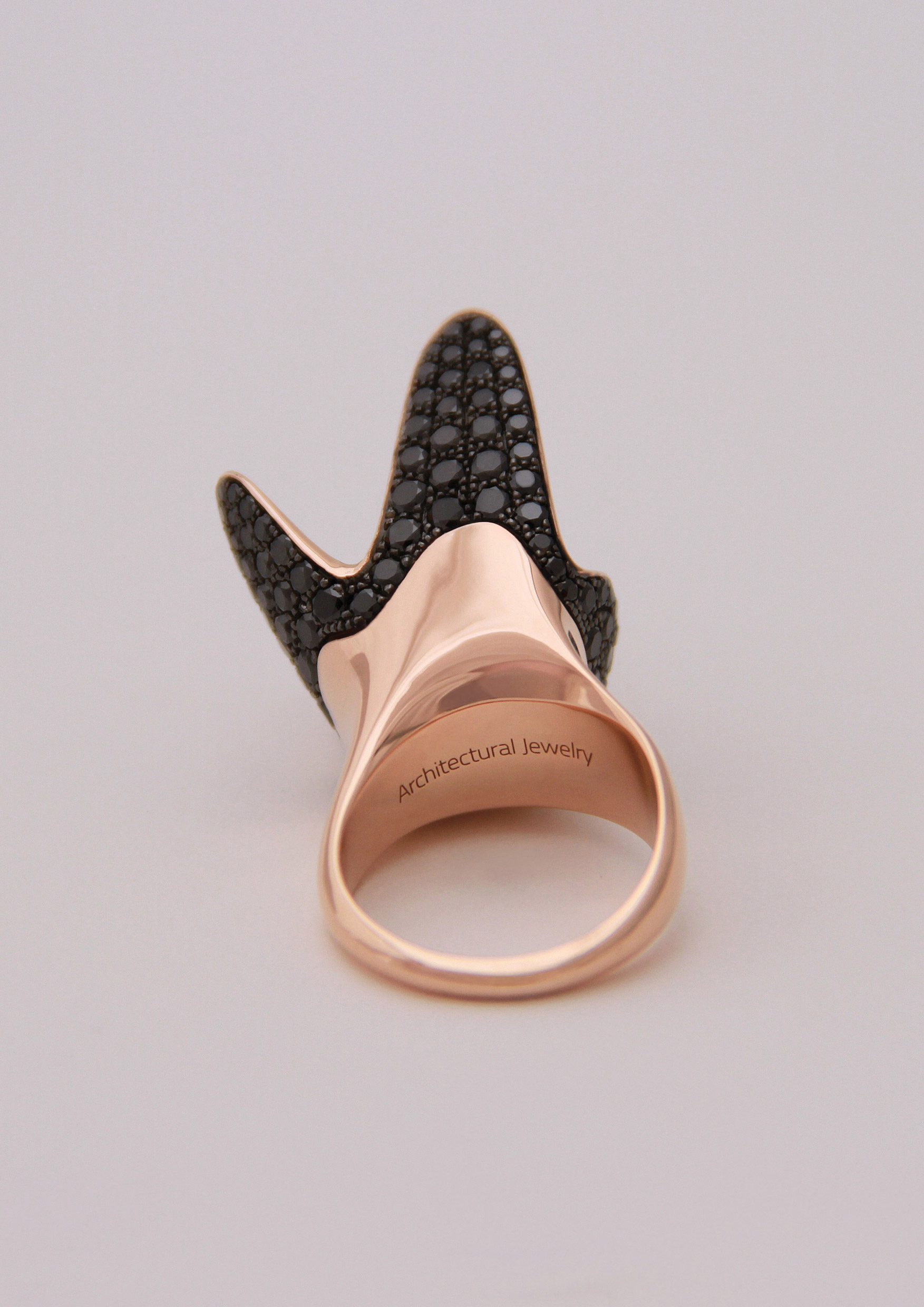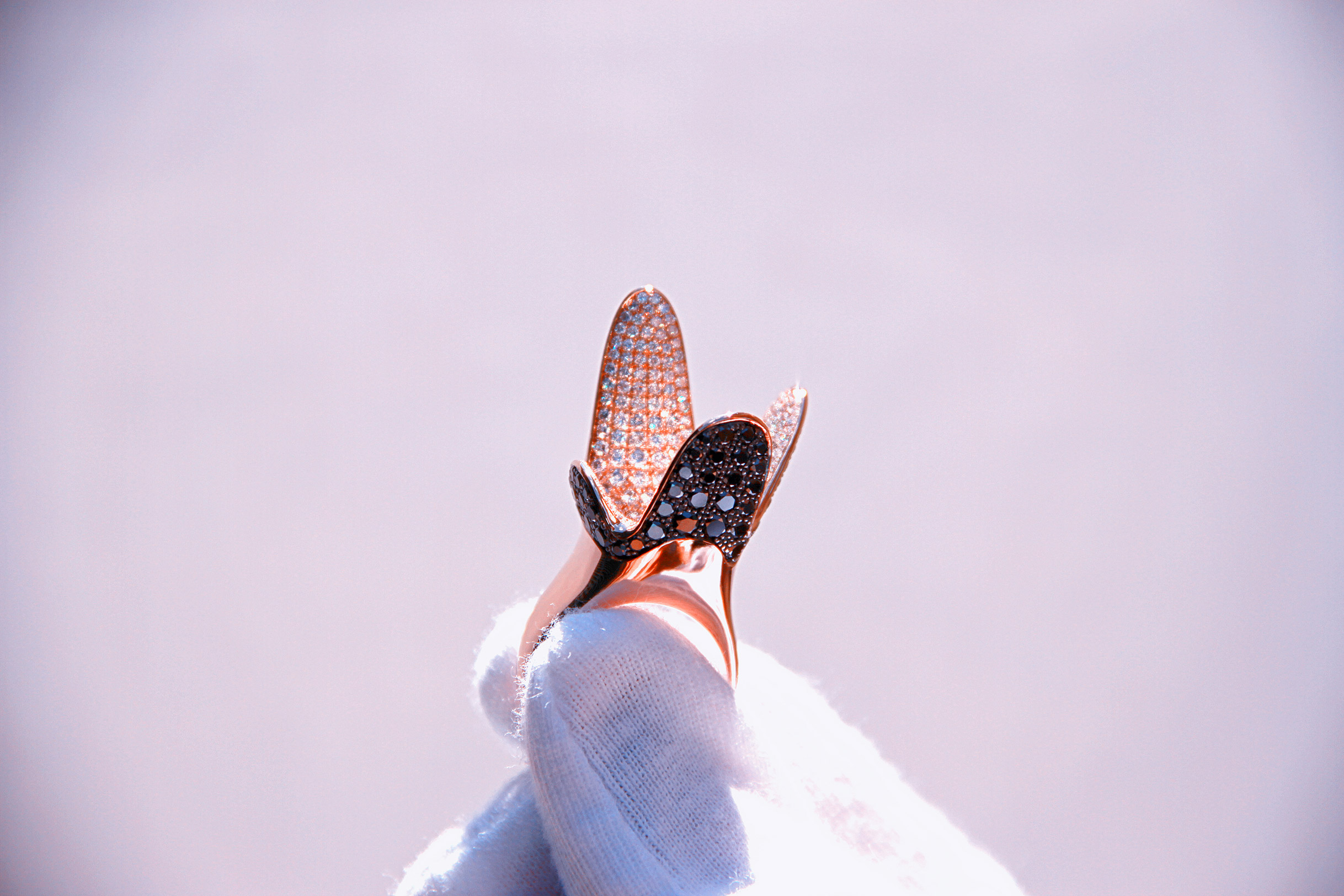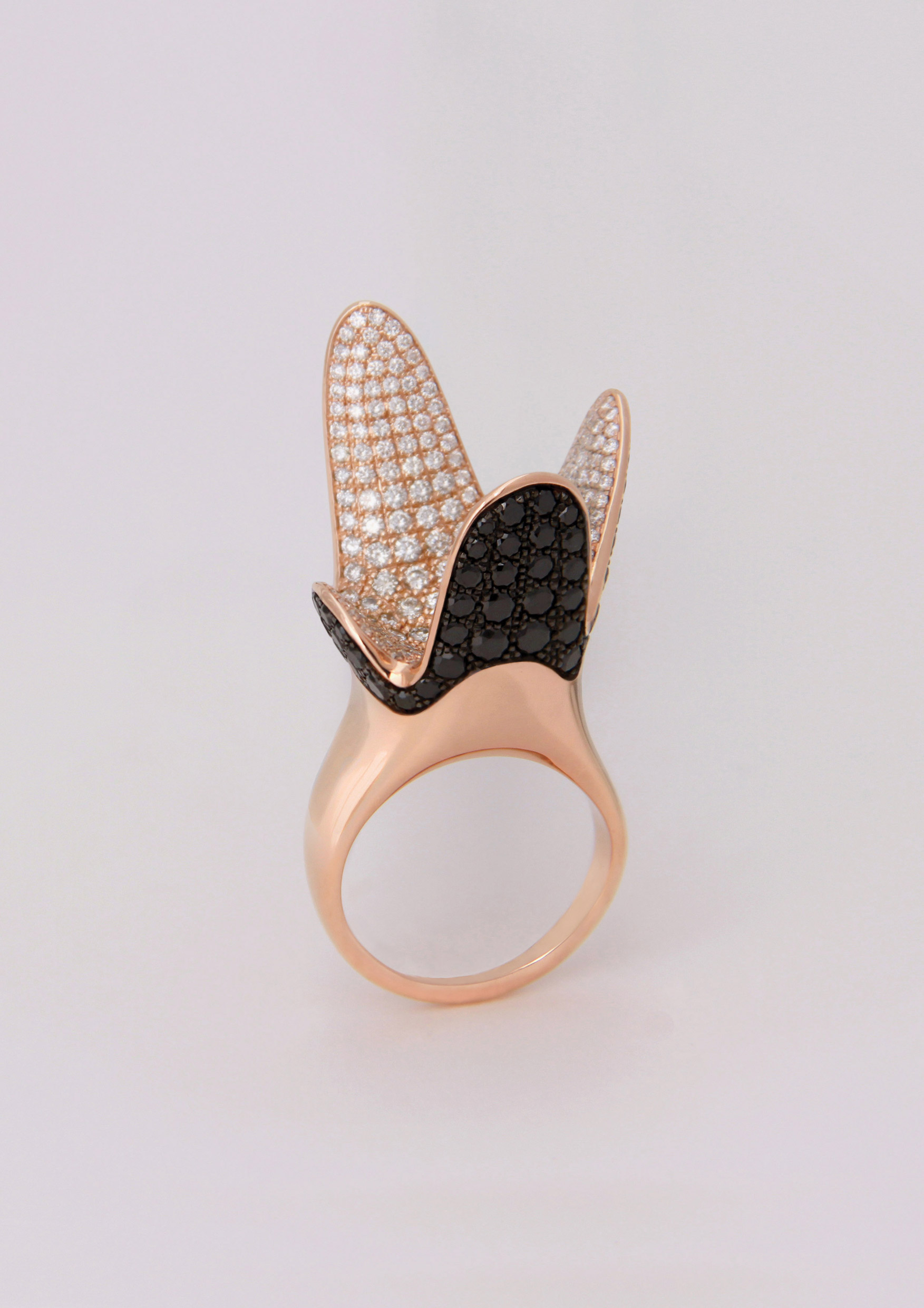 Oro rosado de 18 quilates, engastado con 232 diamantes blancos de talla brillante por un total de 1,95 quilates y 96 diamantes negros brillantes por un total de 2,67 quilates.